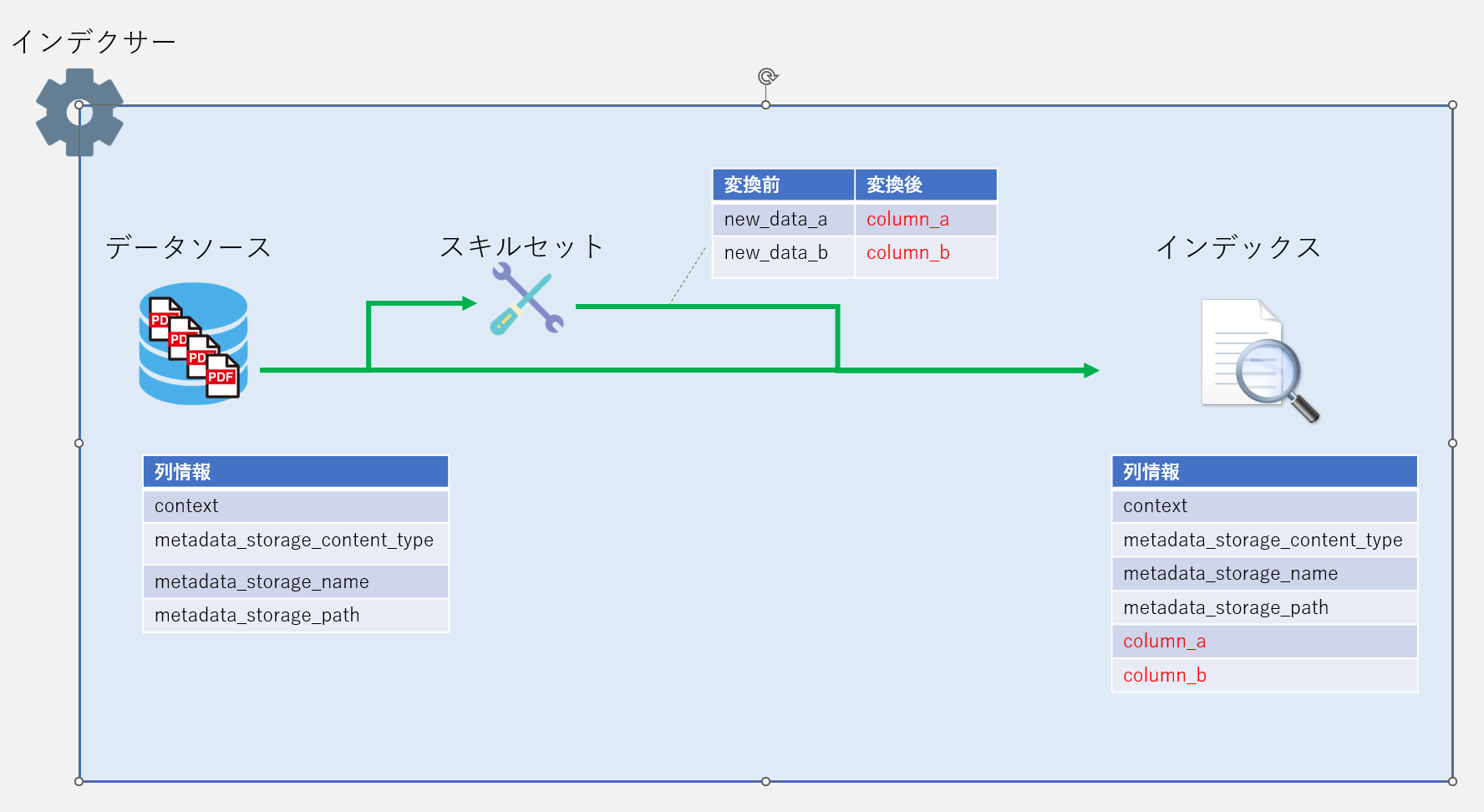 - スキルセットとインデックスの仲介役、スキルセットで出力した新しいデータをインデックスのどの列に出力したいかをマッピングできる
