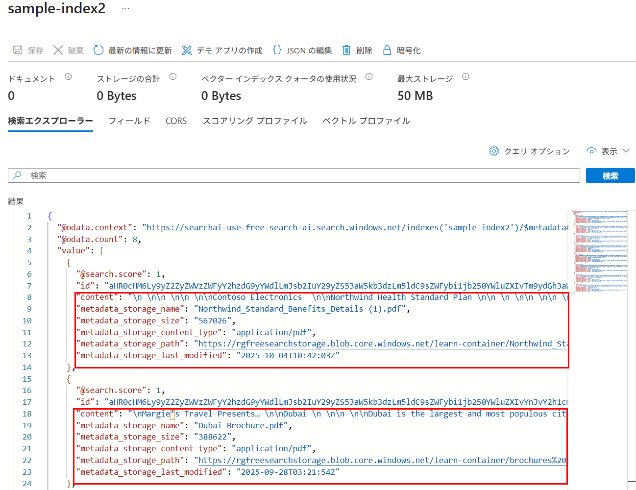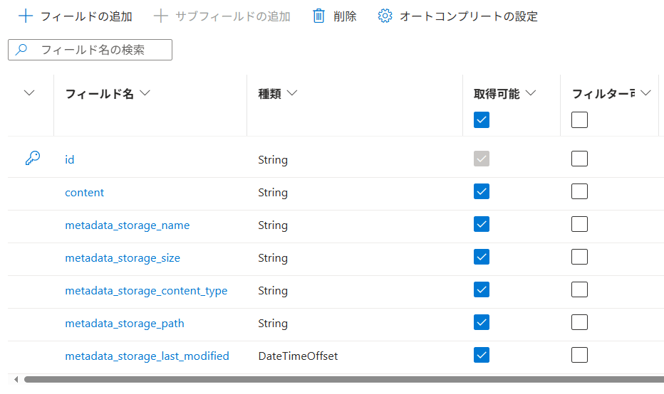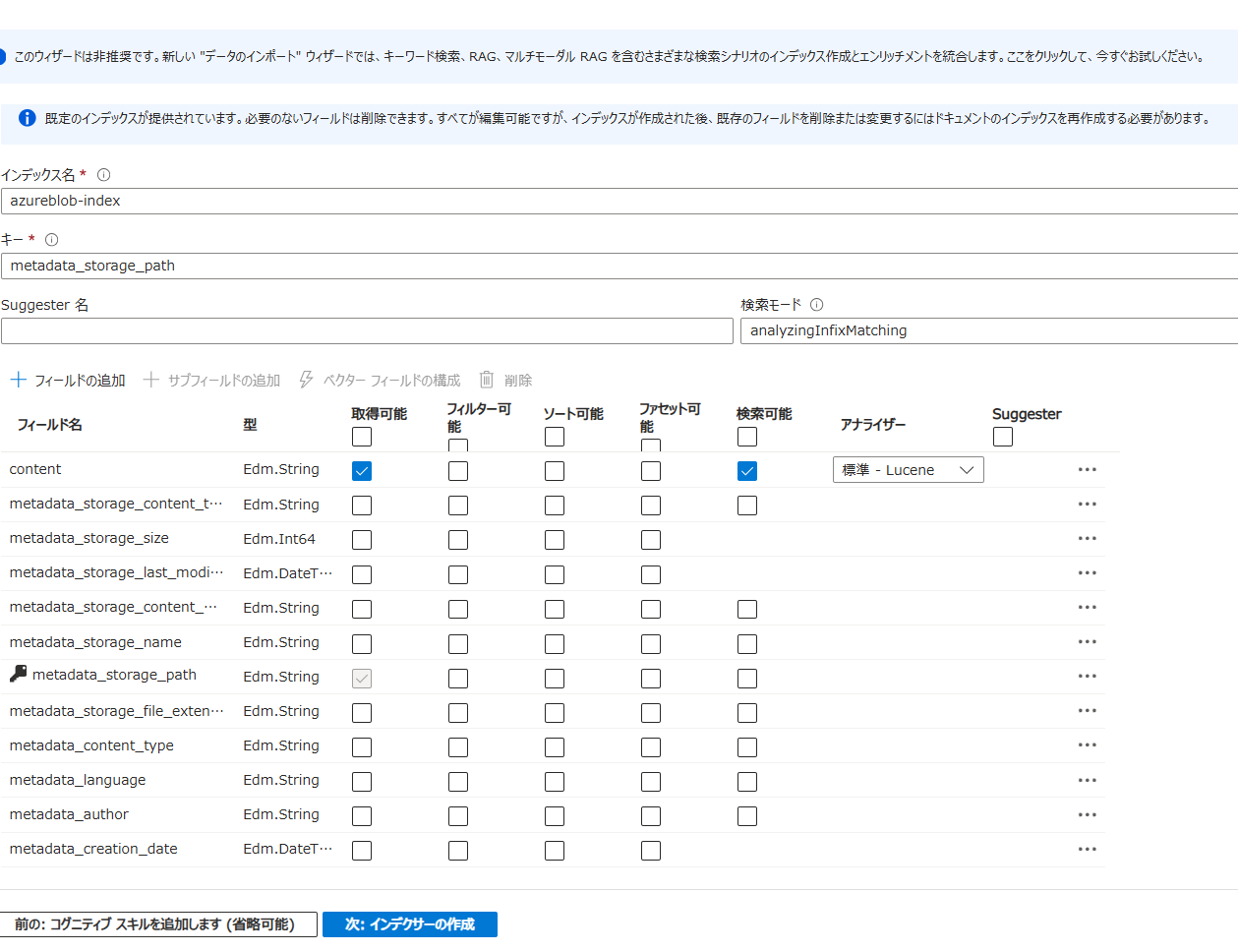 前記事「Azure AI Searchで最小のインデックスを作成する」で、最小構成のインデックスにはidフィールドしか設定されないことを確認した。RAGではドキュメント内のテキスト(content)をインデックスに格納しないことには、そもそもの検索が出来ない。また、テキストだけでなく、ファイル名やファイルの作成期間などのメタデータを用いると、検索の手段が増えてより便利である。