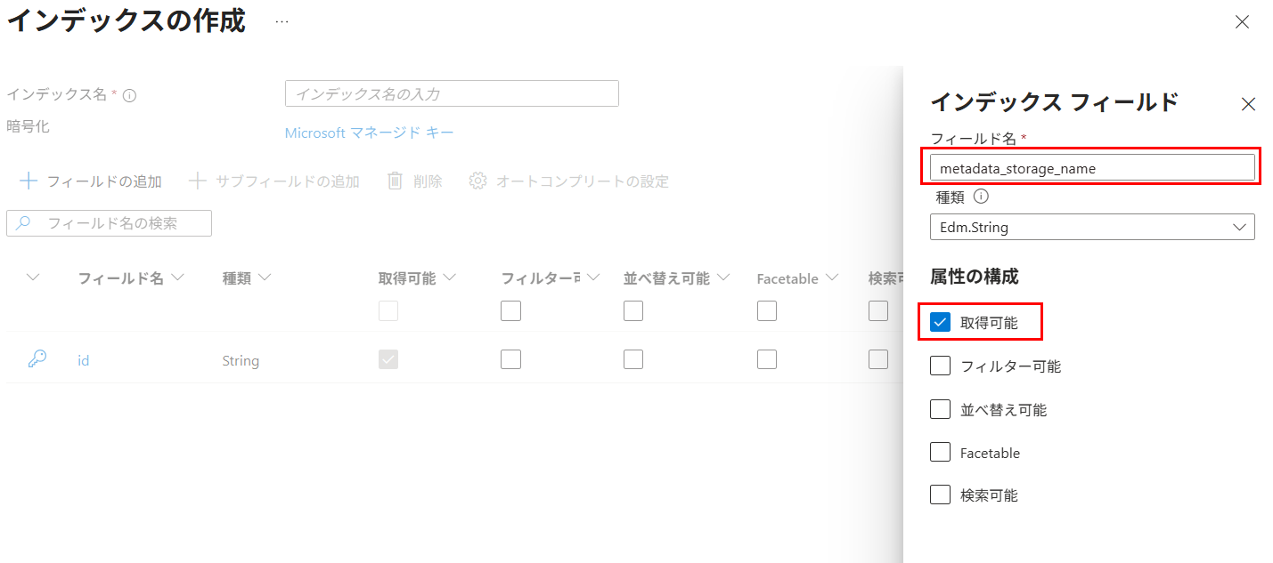 型の検索インデックスに、BLOB のメタデータ キーと同じ名前のフィールドを定義する必要があります。