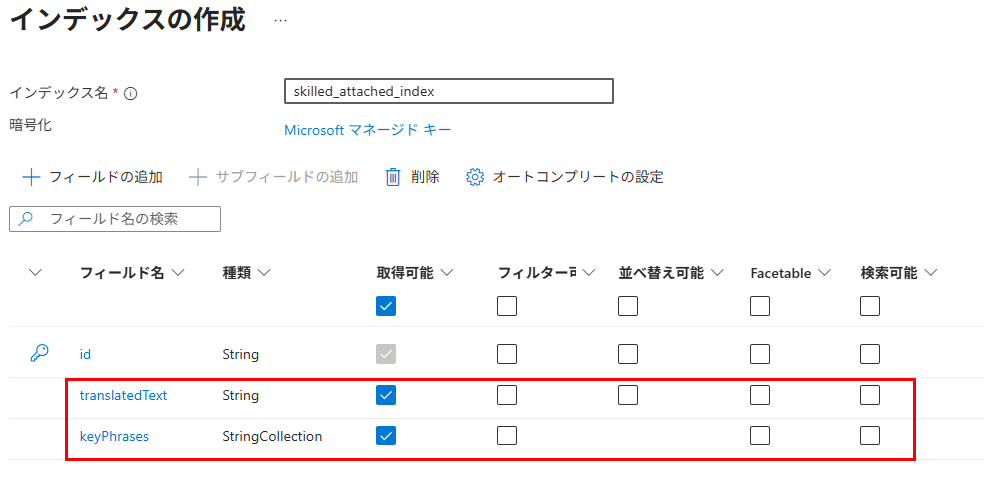 スキルセットの出力結果とインデックスのフィールドを紐づける必要がある。