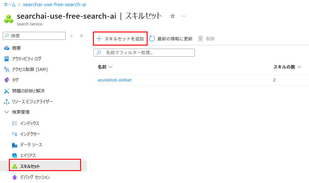 AI Searchリソース管理画面から、「+ スキルセットを追加」を押下