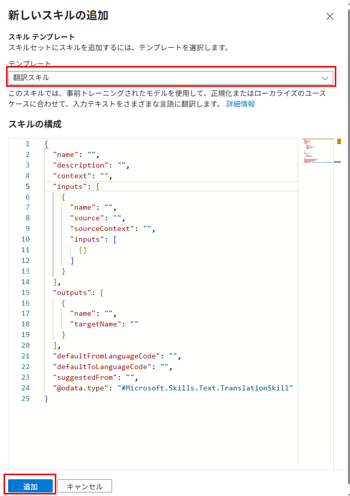 テンプレートから「翻訳スキル」を選択し、「追加」を押下。