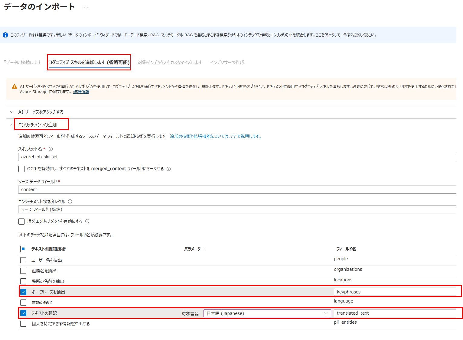 今回はテキスト翻訳「TranslationSkill」とキーフレーズ抽出「EntityRecognitionSkill」の2つのスキルを作成する