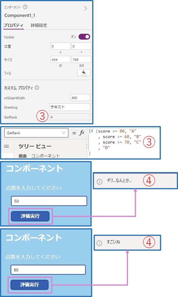 - 50点はデフォルトの定義ではランクDだが、アプリケーション側の定義に則ってランクCのメッセージが表示されている。80点の時も同様。