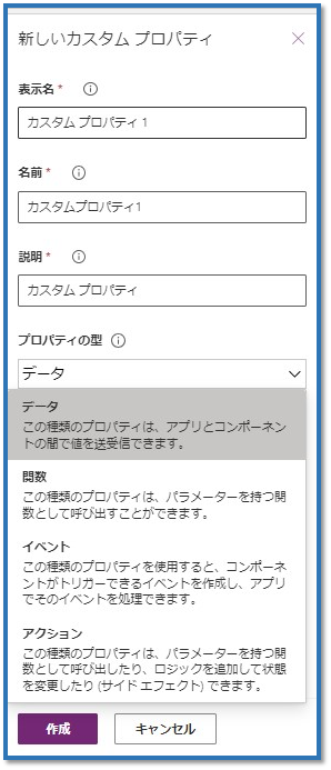 ONにすると以下のようにプロパティの型から「データ」「関数」「イベント」「アクション」を選択できるようになる。