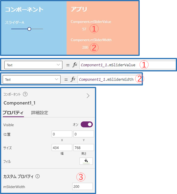 - プロパティの定義が「出力」の場合、アプリケーションからデータプロパティの値を取得することができる。つまり、「出力」データプロパティはgetterであると考えることができる。また、アプリケーションからコンポーネント上のオブジェクト(今回の例ではSliderA)へ直接アクセスをすることができない(Component1_1.mSliderAは参照不可)。ゆえにコンポーネント上のオブジェクトの情報を取得は必ずデータプロパティを経由して取得しなければいけない。
