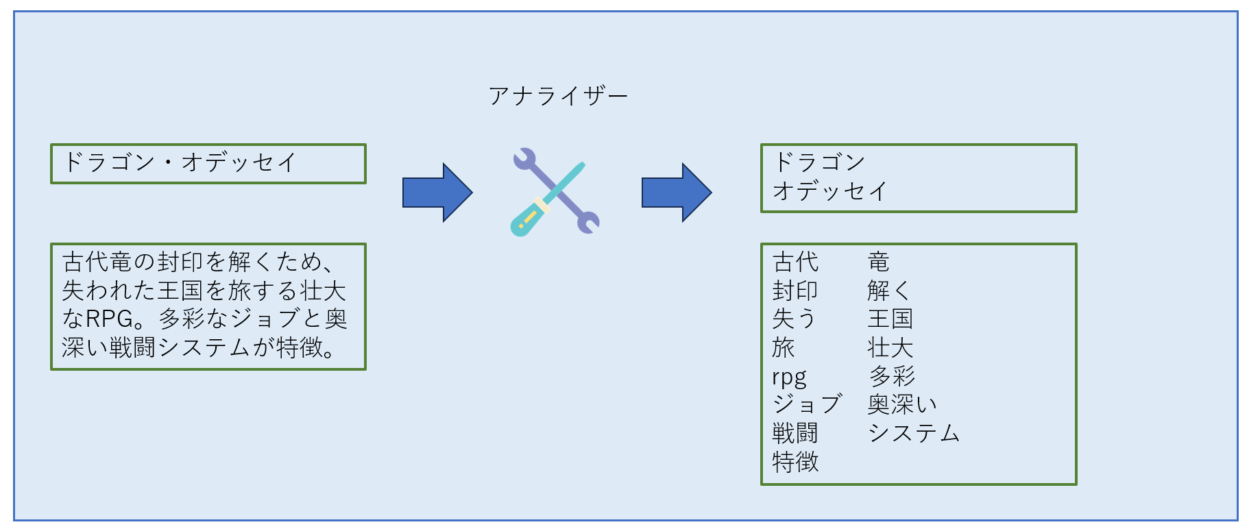 )での検索を行う。例として、ホテル情報が蓄えられたインデックスで「景色のいい海辺にあるホテル」と検索した場合「景色のいい/海辺/ホテル」のような形で分割される。
